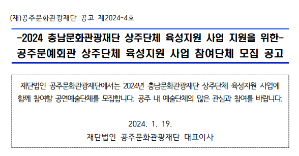 본 공모 URL: 충남문화관광재단 상주단체 육성 지원사업 관련 공고문(클릭)